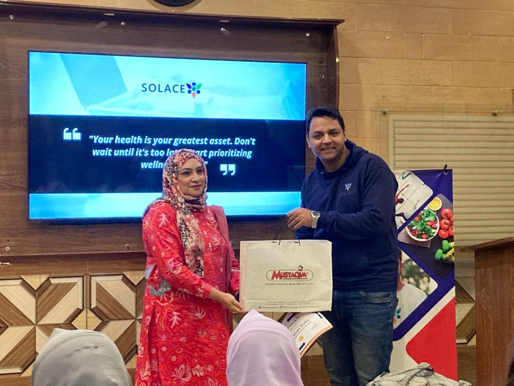 Mustaqim Dyeing & Printing Industries (Pvt.) Ltd collaborated with SOLACE to organize an Employee Wellness Session & Industrial visit for our Wellness League participants. Our Corporate Wellness Session was led by our Founder Hasan Tahir. while Wellness Executive, Abdullah Musharraf shared invaluable ergonomics tips and led engaging fitness exercises. Our interns facilitated stress management surveys and art activities.
